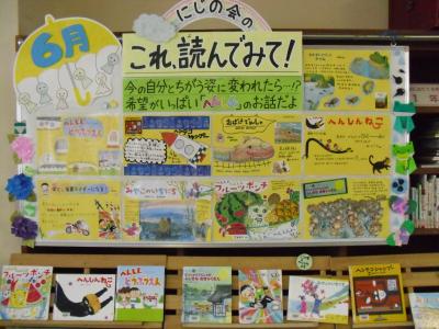 学校図書ボランティア「おはなしにじの会」のみなさんが、図書室に楽しい掲示をしてくださいました。