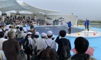 イルカショーの時には雨も小雨になりました。イルカショーでは1時間前から最前列を陣取り、イルカたちが繰り広げる様々な技に見入っていました。
