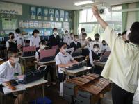 【2年生の様子】音楽で、カスタネットやトライアングルでリズムを伝えあいました。