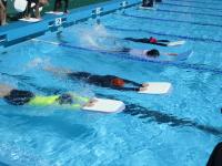だるま浮き、くらげ浮き、ふし浮きをした後、けのび、ビート板キックを練習し、最後にクロールの記録測定をしました。